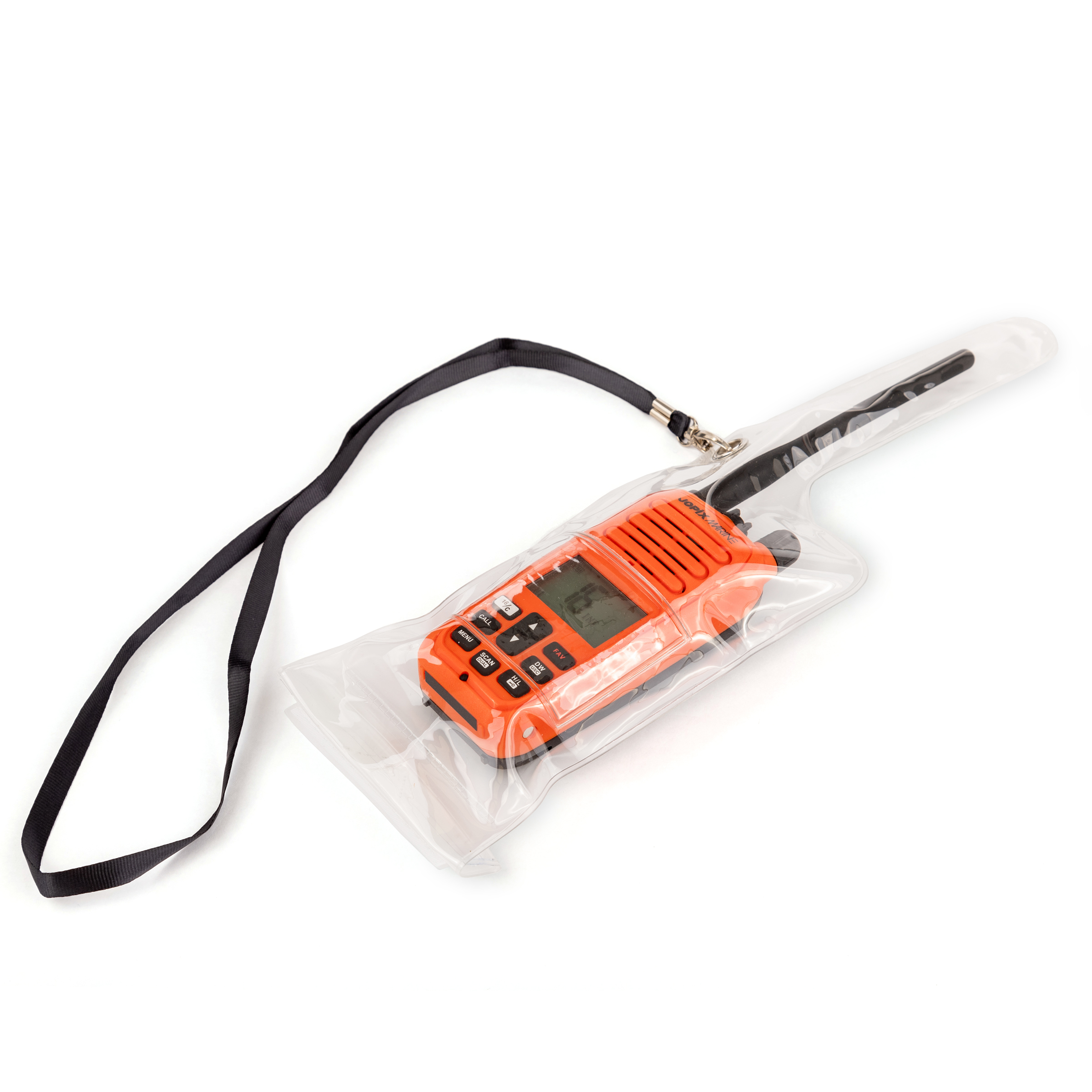 Αδιάβροχη θήκη μεταφοράς πομποδέκτη, ανθεκτική, με ειδική εσοχή για την κεραία και ρυθμιζόμενο λουράκι ώμου-μέσης, με κούμπωμα ασφαλείας.