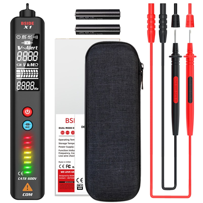 Ανιχνευτής τάσης χωρίς επαφή (NCV) ή με επαφή ( έως 500V AC/DC) αυτόματη ή χειροκίνητη επιλογή εύρους μέτρησης. Ενδείξεις σε Οθόνη LCD 4 ψηφίων, ηχητική ένδειξη και σε μπάρα με Led. Μπορεί να μετρήσει αντίσταση έως 10MΩ, συχνότητα έως 1KHz. Διαθέτει και λειτουργία φακού.