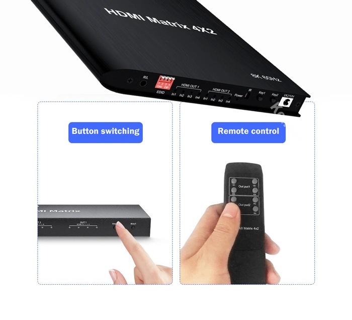 Το HDMI matrix switch σας επιτρέπει την εύκολη εναλλαγή μεταξύ 4x συσκευών εισόδου όπως PC ή gaming κονσόλες σε 2x συσκευών εξόδου όπως οθόνες ή τηλεοράσεις. Η εναλλαγή γίνεται μέσω πλήκτρου ή ασύρματου τηλεχειριστήριου το όποιο συμπεριλαμβάνεται στην συσκευασία.